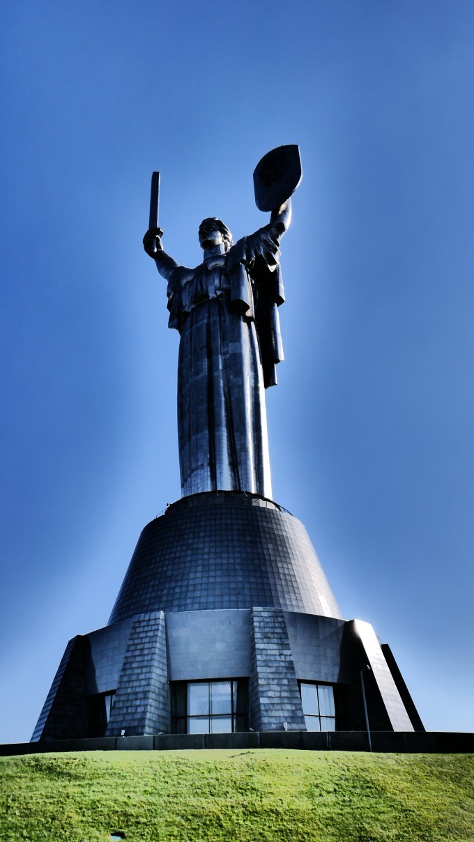 The statue is a 340Ft Stainless steel statue of. Woman holding a sword and a shield, the Kiev Coat of arms on the shield glistens in the Sunlight and in all of her glory looking out across the city , she isn’t sad … but she isn’t happy she just watches and looks out towards the east.
