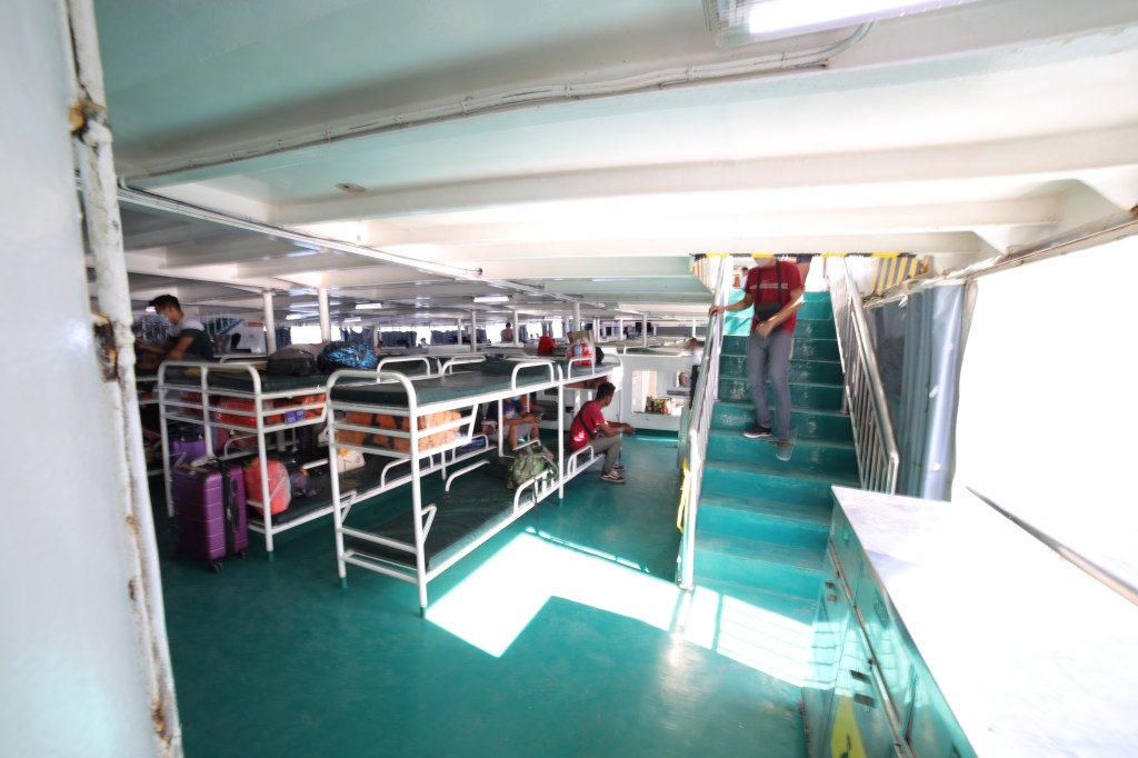 on the first level of the boat their is around is around 60 bunks all numbered with a mixture of tourists and locals lying down sweating in the harbour, the side of the boat is open and there is no Air Conditioning.