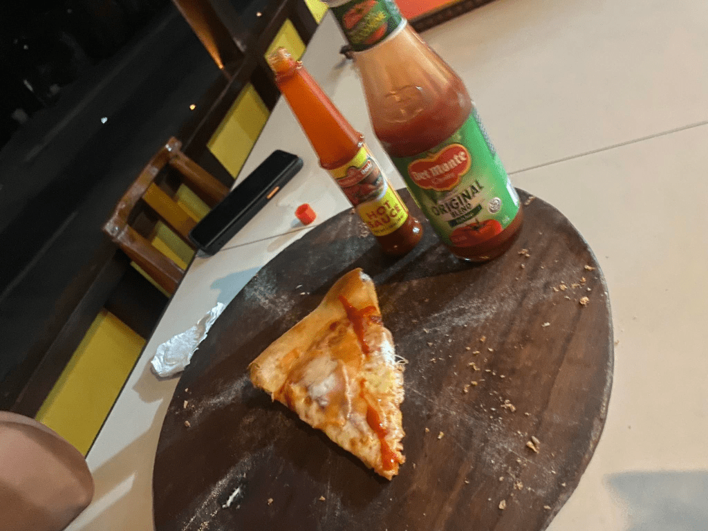 Dinner is a Salmon pizza on a thin crust and to be honest its actually a very good base with not too many toppings, we share it and as were finishing the last slice the rain starts to fall from the heavens above.
