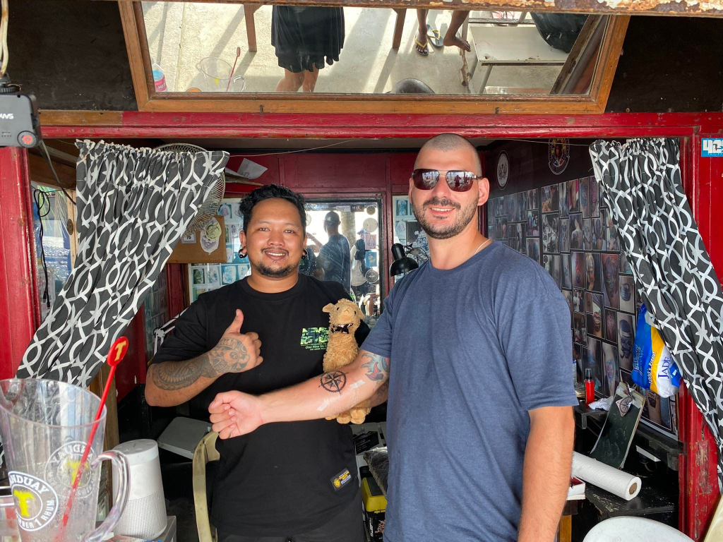 i tell him a Kiwi From New Zealand and while marge is on the case of food i talk to this gentleman (forgot his name all ready). but we spoke for an extended period of time. he is a Retired welder and moved out to the philipines upon his retirement, he is also a tattoo artist and noticed the amazing gladwrap job on my forearm and asked about it.